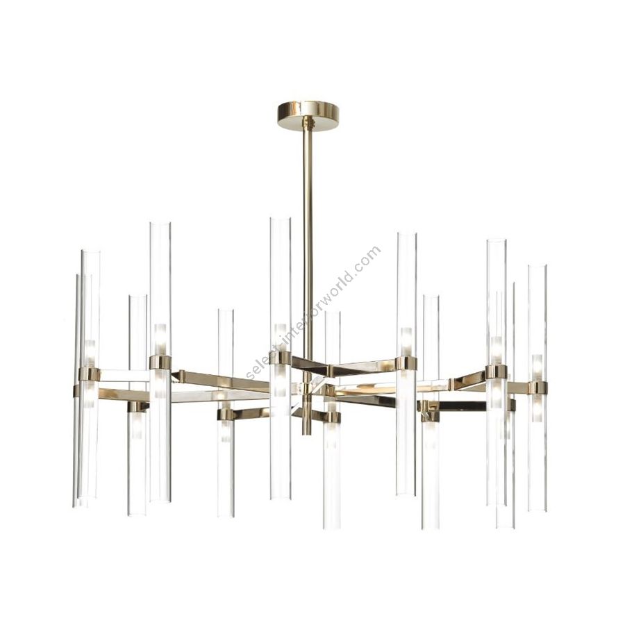 Chandelier with borosilicate glasses, structure in soft gold finishing. Lighting item that diffuses the light with great effect in the surrounding environement creating a warm and welcoming atmosphere.