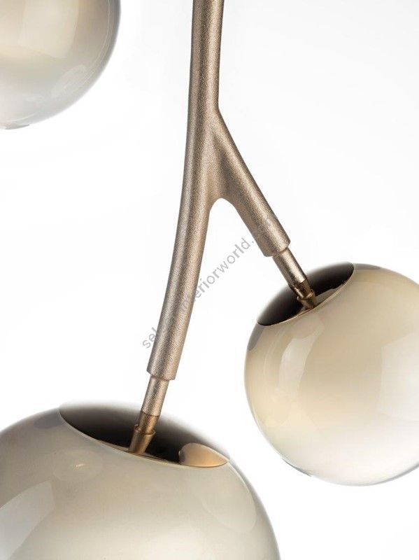 Chandelier with white glass spheres and sanded brass arms. Lighting item that diffuses the light with great effect in the surrounding environement creating a warm and welcoming atmosphere.
