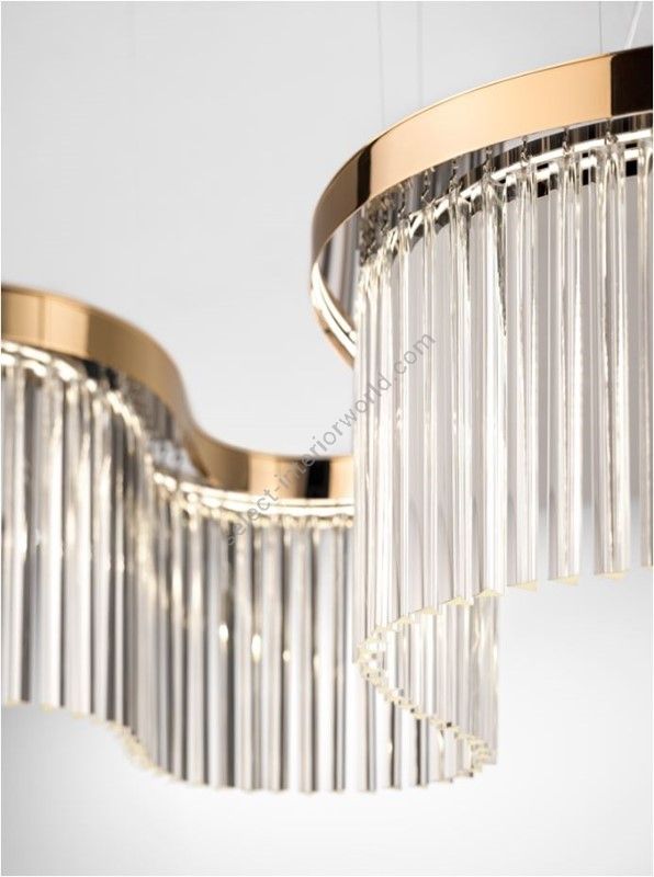 Sinuous Chandelier in Clear Trihedral Glass and 24K Gold Finish A sculptural, sinuous chandelier featuring elegant wave-like lines that bring movement and lightness to any space. Crafted in metal with a 24K gold finish and adorned with premium clear Trihedral glass rods, this lighting piece blends luxury and modernity in a single creation. Its fluid shape makes it ideal for dining rooms, grand entrances, wide corridors, or any setting that requires a striking focal point. Available as both a pendant chandelier and a ceiling-mounted fixture, it easily adapts to various interior design styles. A refined, unique, and visually impressive statement piece that elevates any environment with timeless elegance.