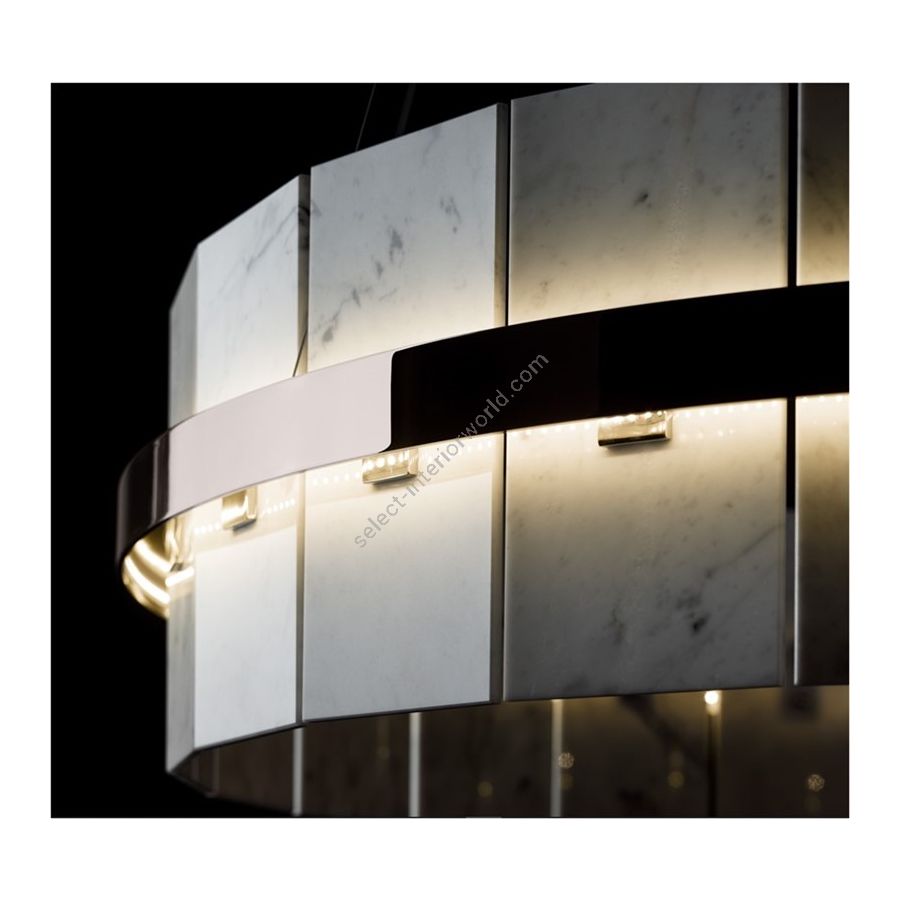 Round chandelier in brass with Carrara marble tiles. Lighting item that diffuses the light with great effect in the surrounding environement creating a warm and welcoming atmosphere.