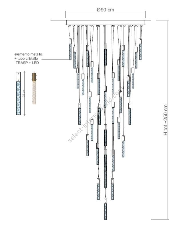 The chandelier is a luminous work of art composed of 33 hand-carved crystal elements. Each piece of crystal is carefully crafted to create elegant patterns and refined details. The LED light is incorporated into the chandelier, providing a modern and bright illumination to the surrounding environment. This combination of modernity and elegance makes the chandelier a versatile design element that can adapt to various styles of decor, adding a touch of luxury and sophistication to the spaces where it is installed