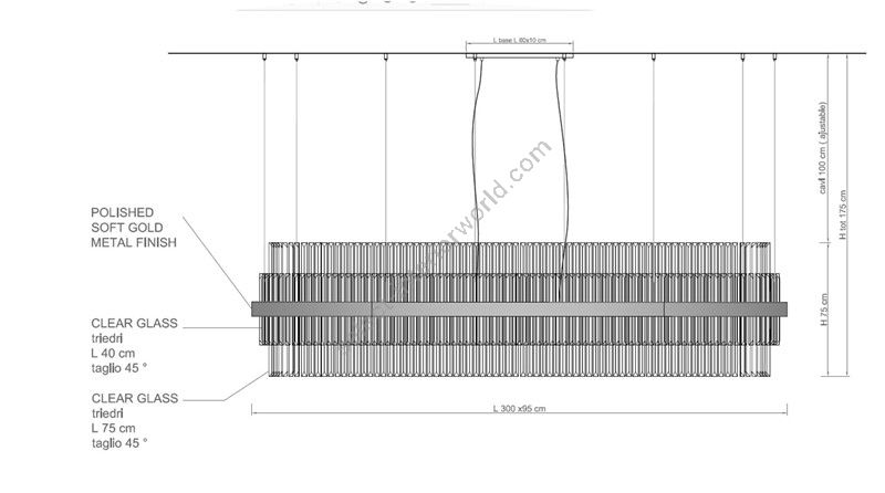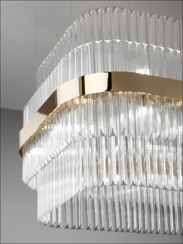 Chandelier with transparent trihedrons. Lighting fixture that diffuses the light into the surrounding environment with great effect, creating a warm and welcoming atmosphere. Shiny metallic band in SG Soft Gold. Hooking system with adjustable steel cables.