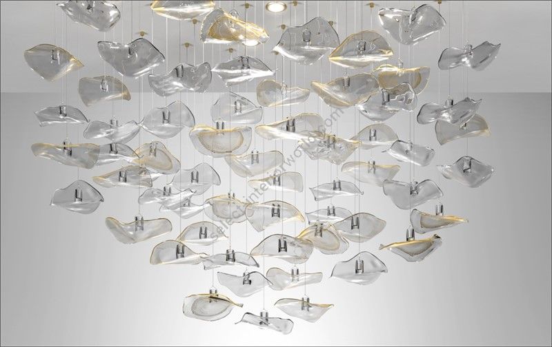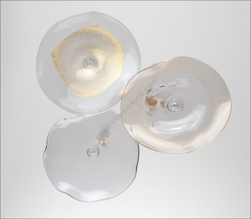 The chandelier is an elegant fusion of transparent and gold Murano glass discs, mounted directly to the ceiling without any visible metal plate. The transparency of the discs provides lightness and brightness, while the gold adds a touch of warmth. The suspended design creates an ethereal atmosphere, highlighting the beauty of the materials without metallic interferences. It is a luminous work of art that combines luxury and sophistication in ambient lighting.
