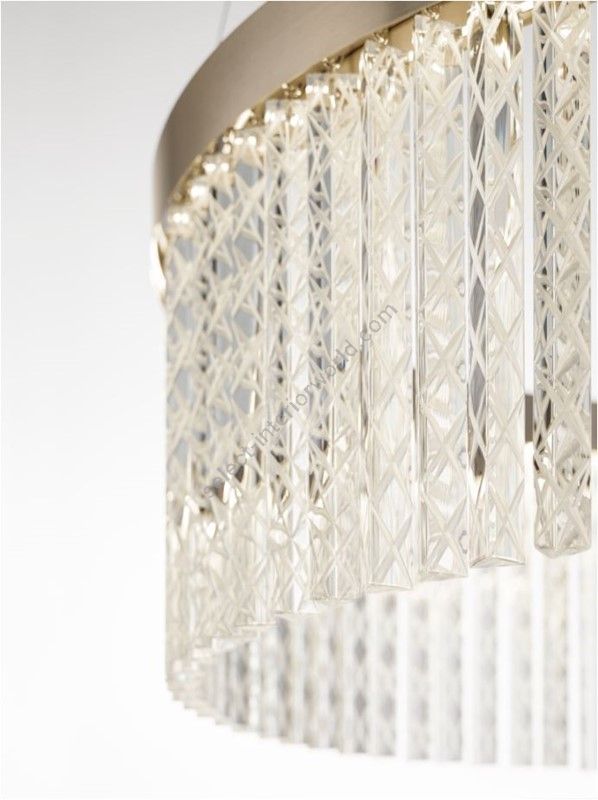 Add a touch of elegance to your home with this contemporary chandelier featuring a harmonious circular shape. Crafted with hand-engraved Triedro glass with a sophisticated diamond pattern, it creates a unique and enchanting lighting effect. The LED strip emits a soft and harmonious glow, while the reflections from the three-sided glass engraving produce a breathtaking play of light. Perfect for elegant and prestigious interiors, it is a true masterpiece of design and craftsmanship.