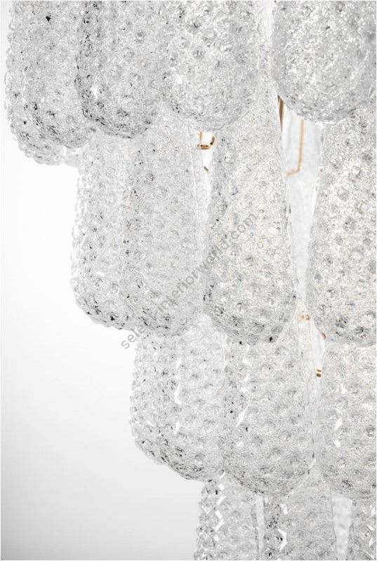 Spectacular cascading chandelier, featuring a gold metal frame supporting numerous drop-shaped glass elements with a textured surface. Arranged on multiple tiers, the drops create a dynamic and brilliant effect, reflecting the light in a striking way. Elegant and majestic, it is ideal for large living areas, stairwells, or entrance halls, where it becomes the absolute centerpiece of the décor.