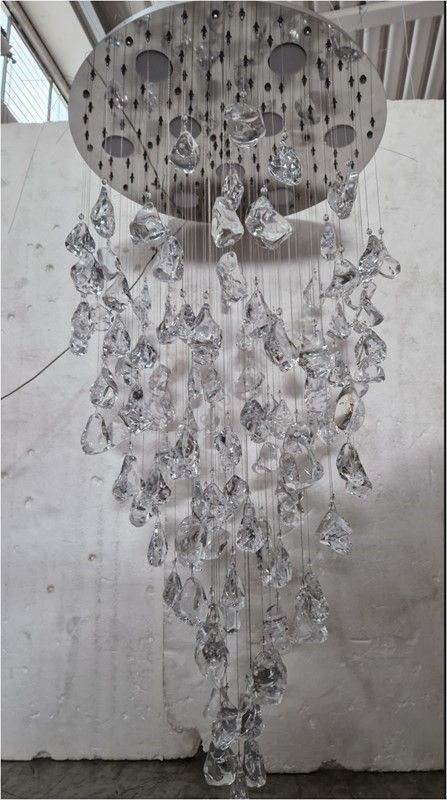 The cascading chandelier is a scenographic work of art that immediately captures attention thanks to its unique and elegant design. Composed entirely of ice-effect crystal, this chandelier creates a harmonious and spectacular play of light, illuminating the environment with timeless elegance. In summary, the cascading chandelier with ice-effect crystal is a unique piece of furniture, capable of enhancing any space with its beauty and breathtaking light. 120 Crystall ice
