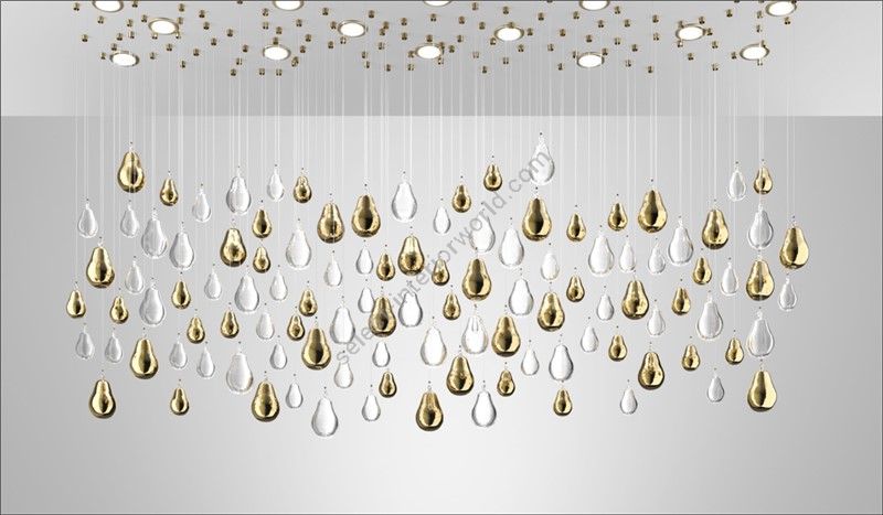 This luxurious chandelier, featuring transparent Murano glass droplets and 24K gold details, is an impeccable choice to enhance dining rooms, entrances, and majestic spaces. Its timeless elegance and customizable dimensions make it an exclusive lighting fixture, capable of adding a touch of luxury and distinctive style to any environment where it is placed.