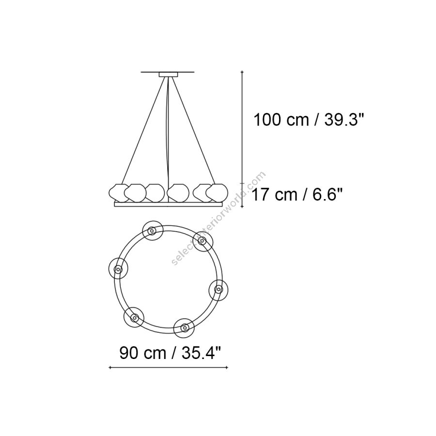 Metal ring chandelier with decorations in borosilicate glass. Lighting item that diffuses the light with great effect in the surrounding environement creating a warm and welcoming atmosphere.