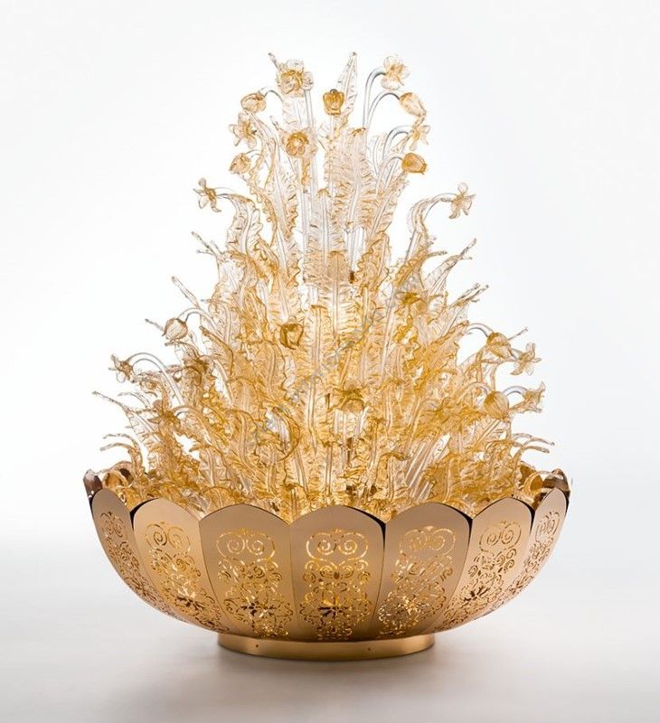 Spectacular and giant floor lamp suitable for entrance or center room covered with perforated metal bowl with 24k gold bath and blown Murano glass with 24K gold decoration. Lighting item that diffuses the light with great effect in the surrounding environement creating a warm and welcoming atmosphere.