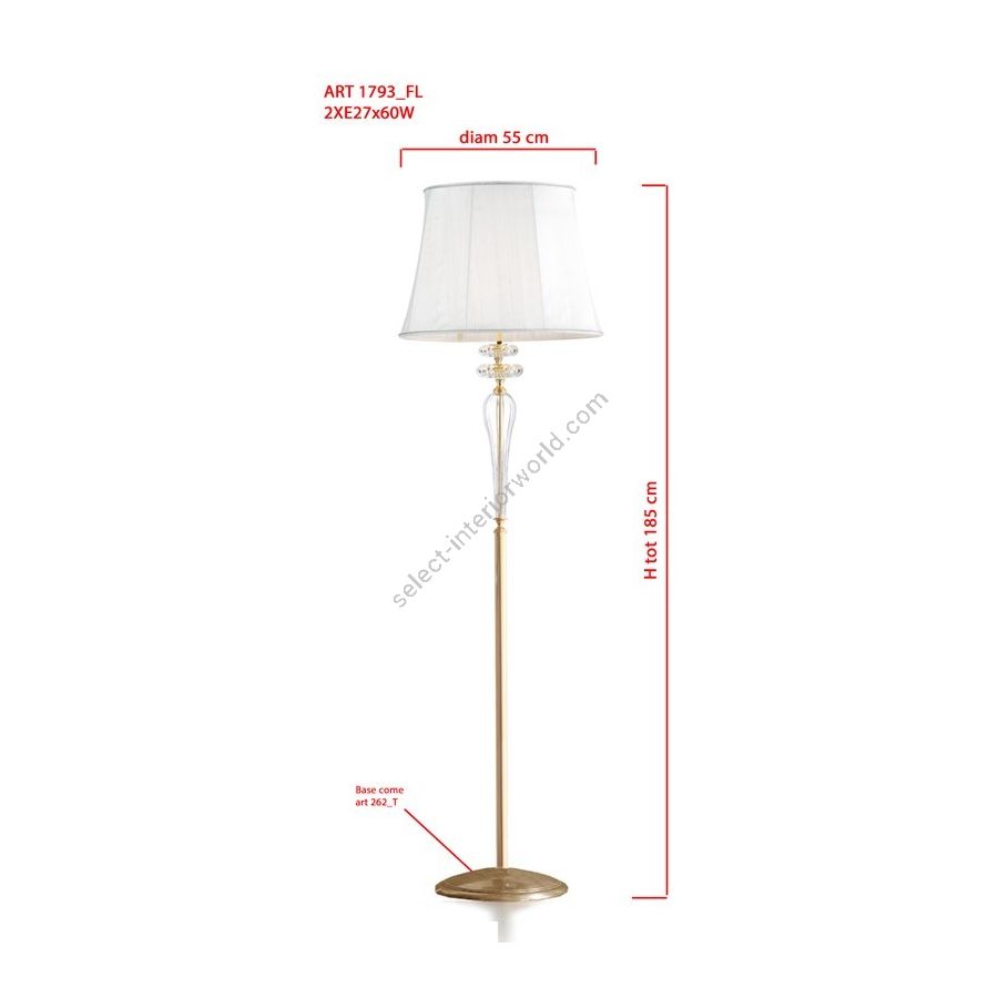 Amarillis Collection: Floor lamp in clear Murano glass with light ivory lampshade in double fabric with crystal trimming. Lighting item that diffuses the light with great effect in the surrounding environement creating a warm and welcoming atmosphere.
