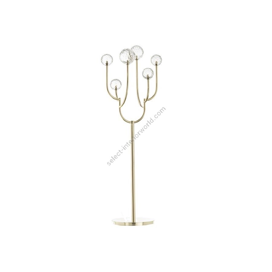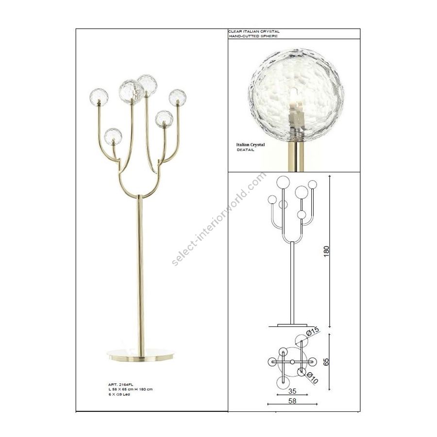 Floor Lamp in soft gold finish with hand-cut Italian crystal spheres. Lighting item that diffuses the light with great effect in the surrounding environement creating a warm and welcoming atmosphere.