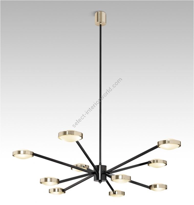 The sumptuous large chandelier with a diameter of 213 cm is a striking creation that appears to float in the air. Ideal for grand entrances, hotel lobbies, and villas, this chandelier boasts a contemporary style with captivating contrasting colors. The combination of black paint and polished brass, inspired by Art Deco style, adds a touch of elegance and modernity.
