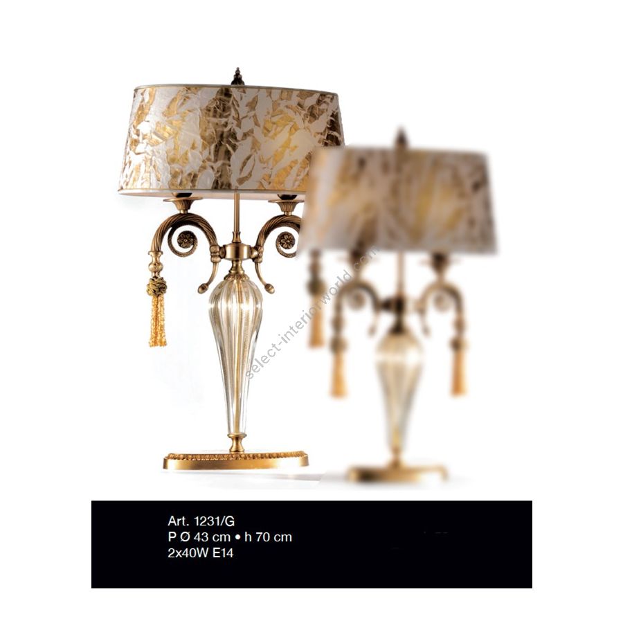 Lamp with 2 lights in old gold with element in transparent and gold Murano glass, lampshade in gold leaf fabric. Lighting fixture that diffuses the light into the surrounding environment with great effect, creating a warm and welcoming atmosphere.