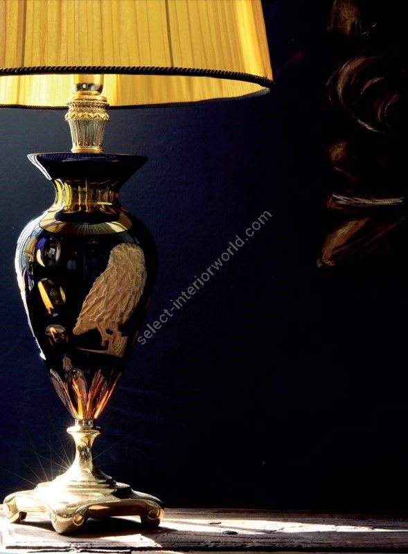 Luxurious table lamp in Florentine crystal carved by hand. There is double switch which illuminates all the beauty of the amber/blue crystal from inside. The silk lampshade made by hand completes this masterpiece of artisan craftsmanship. Lighting item that diffuses the light with great effect in the surrounding environement creating a warm and welcoming atmosphere.