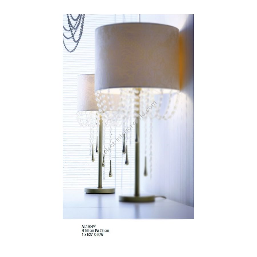 Table lamp with lampshade with Asfour and Murano gold Drops. Lighting item that diffuses the light with great effect in the surrounding environement creating a warm and welcoming atmosphere.