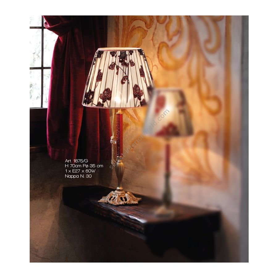 Table Lamp in brass with application of strass and fabric lampshade. Lighting item that diffuses the light with great effect in the surrounding environement creating a warm and welcoming atmosphere.