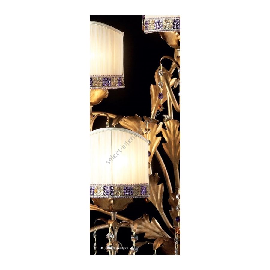Wall lamp in gold metal, Asfour pendants and fabric lampshades in chiffon. Lighting item that diffuses the light with great effect in the surrounding environement creating a warm and welcoming atmosphere.