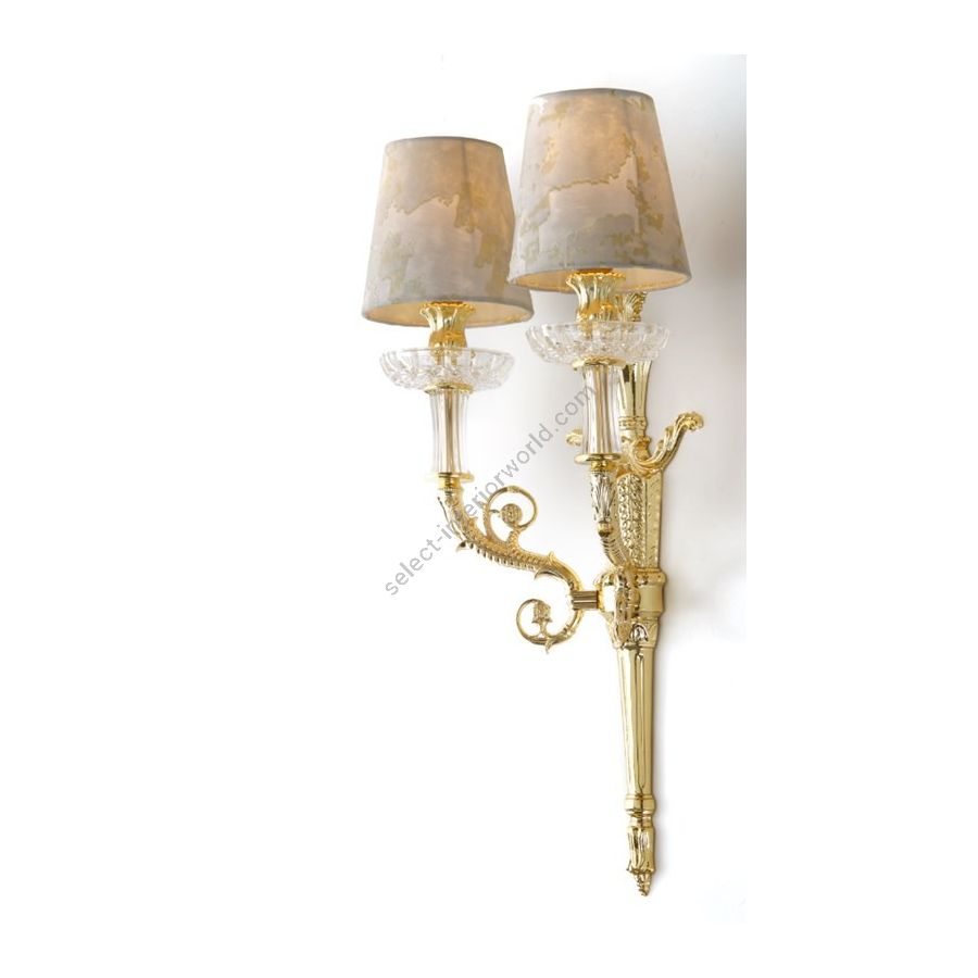 Wall lamp in casting brass and crystal elements. Lighting item that diffuses the light with great effect in the surrounding environement creating a warm and welcoming atmosphere.