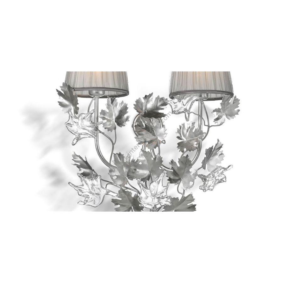 Elegant wall lamp with a harmonic line, Silver metal paint with decorative leaves in transparent glass. Lighting item that diffuses the light with great effect in the surrounding environement creating a warm and welcoming atmosphere.