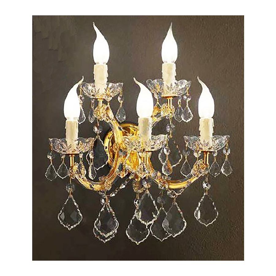 Gold plated metal frame covered by transparent glass arms and transparent Crystal pendants. Lighting item that diffuses the light with great effect in the surrounding environement creating a warm and welcoming atmosphere.