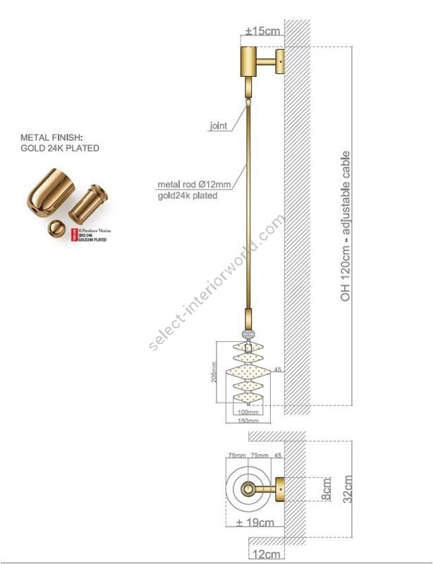 Vinea – Glass and Metal Wall Sconce Vinea is a refined and sculptural wall sconce featuring a metal structure with a 24K gold finish, highlighting its sleek and contemporary silhouette. The design is completed by a clear glass element with delicate gold accents, housing a G9 bulb inside that creates a play of reflections and a soft, warm glow. With a height of 120 cm (˜ 47.2”), Vinea stands out for its elegant proportions and can be custom-made in different heights upon request. Available in 110V for the U.S. market, with a JBOX-compatible base. Other metal finishes available upon request.