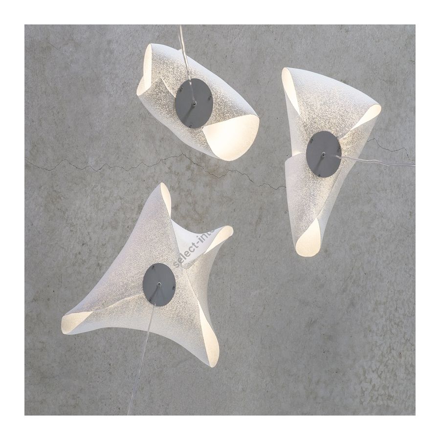 The Ballet collection arises from experimentation, giving rise to forms created from the overlapping or joining of its vertices, leaving freedom to the flexible nature of the material itself. The three pendant lamps of the Ballet collection come together in a spectacular hanging composition to represent the three movements of dance. Fluid, natural and asymmetrical volumes that make their shapes change depending on the point of view. Plié, Relevé, Elancé… A constant dance of light and shadows designed by Héctor Serrano.