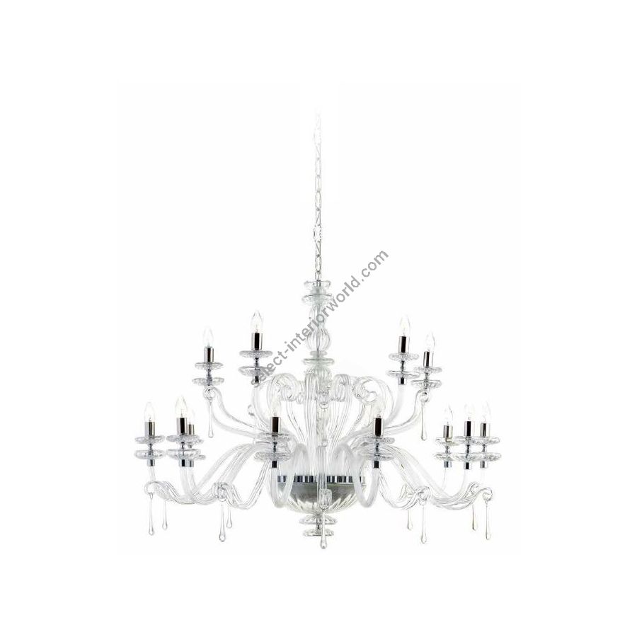 15 lights chandelier in clear Murano glass. Lighting item that diffuses the light with great effect in the surrounding environement creating a warm and welcoming atmosphere.