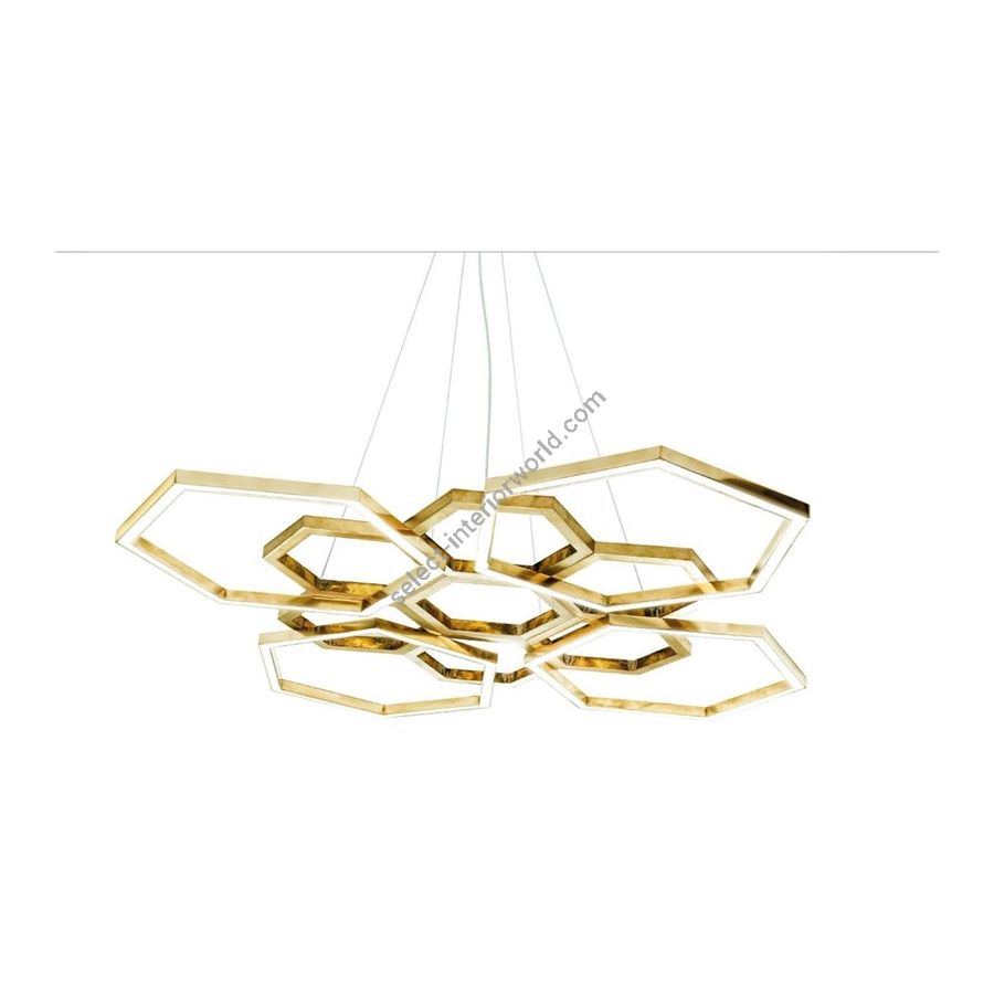 Hexagon collection brass chandelier in polished gold and Led. Lighting item that diffuses the light with great effect in the surrounding environement creating a warm and welcoming atmosphere. Available only SGB soft gold brushed or NB nikel brushed or Paint.