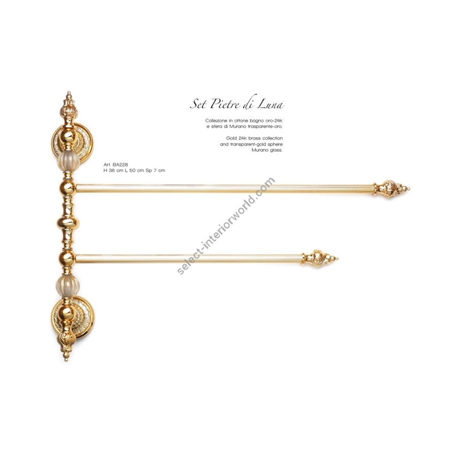 Double towel holder brass finished in gold-24k and transparent-gold Murano's sphere. Functional elements that create an extremely elegant, welcoming and high-value bathroom.