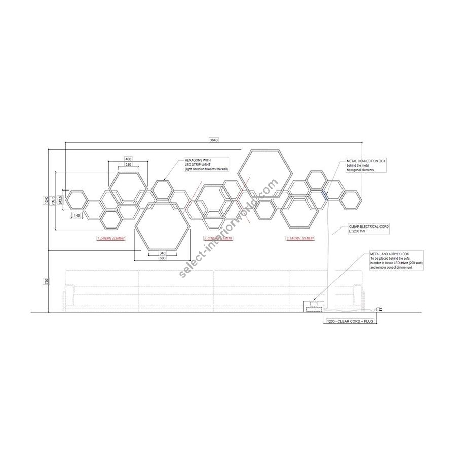 Hexagon collection wall sconce metal Brass with Strip Led. For driver position please see drawing. Lighting item that diffuses the light with great effect in the surrounding environement creating a warm and welcoming atmosphere.