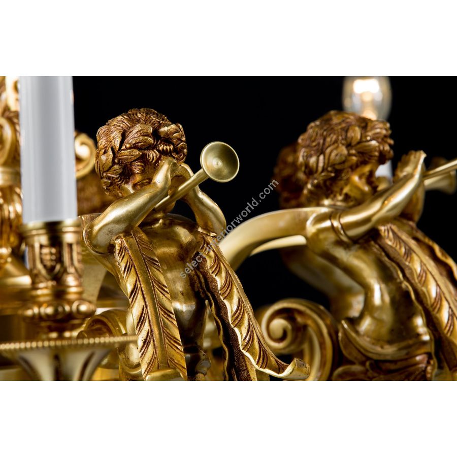 A magnificent Baroque style real gold plated bronze chandelier hand made under the artisan technique of the “lost wax” casting. The chandelier is centered by blue crystal globe surmounted by scrolling foliage, bellow four cherubs blowing a horn. This Baroquem masterpiece is manufactured by Mariner during the last 60 years.