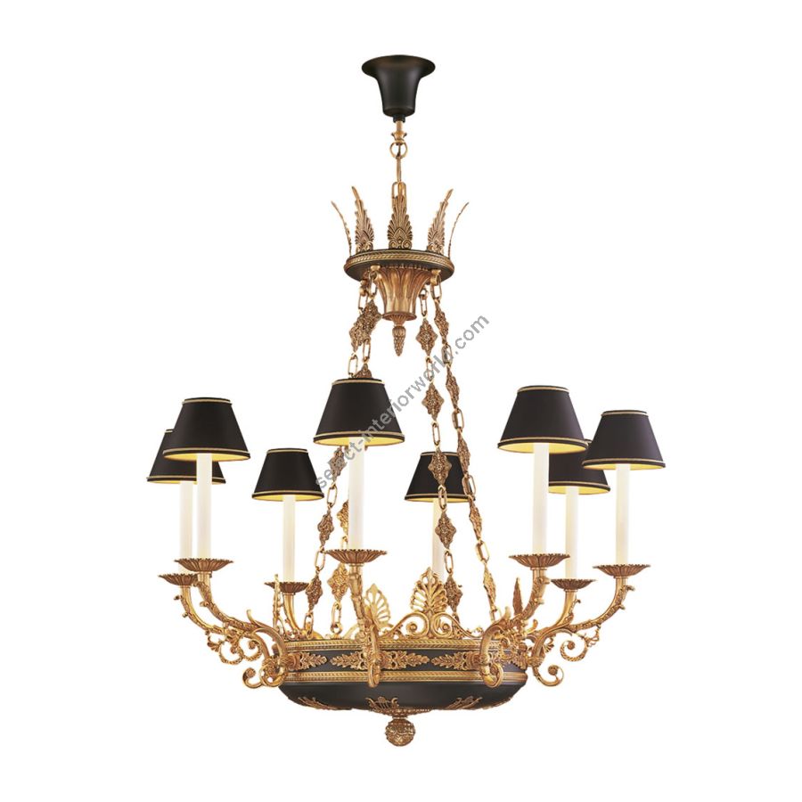 A fine quality eight branch bronze and gilt empire chandelier created by Mariner in the midle of the XX century and reintroduced into our catalogue in 2002. Marked by clear Egyptian decorative influence with a bronze crown of an thermion from wich is suspended a chain of bronze elements. The main dish itself is surmounted by a bronze tazza an is decorated with acantus leaf in high relief.