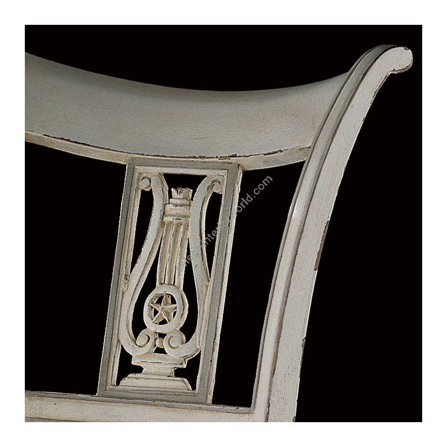 This chair is characterised by the scrolling of the back upright, its pierced panel in the centre of the back and its straight, tapered front legs. The lyre and star dear to Directoire style ornament the openwork centre splat.