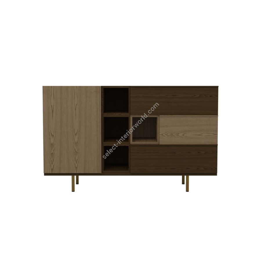 Ash wood sideboard made up of open modules, modules with door and modules with drawer, internal glass shelves, base with adjustable brass feet.