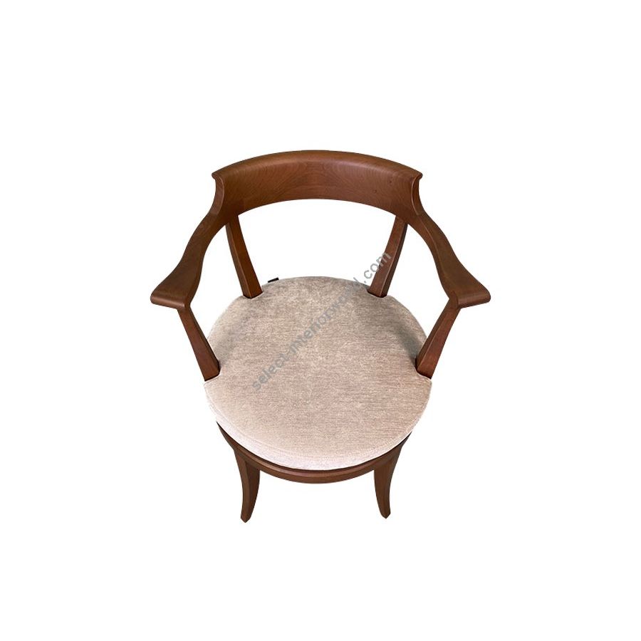Armchair made of cherry wood with armrest and shaped backrest, swivel upholstered seat and saber legs.