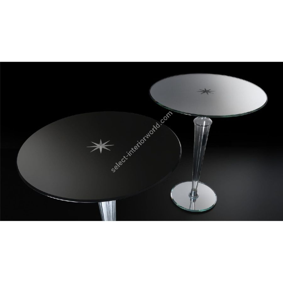 Bar table with leg in Murano glass smooth in transparent or coloured finish. Fixing part in chromed aluminium on a mirror glass base. Top with bevel in transparent glass.