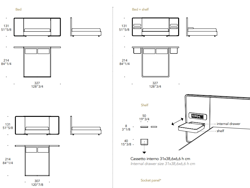 XL version of the OH bed which maintains the rounded frame in Bronze, Brass, Dark Brass, Titanium finish with LED lighting and touch switch. Padded headboard upholstered in leather or fabric with quilting. Plain bed frame. Optional: wooden shelf with drawer in Bronze finish and top in Marmoreflex; arrangement to install switches and sockets, storage with lifting slat.