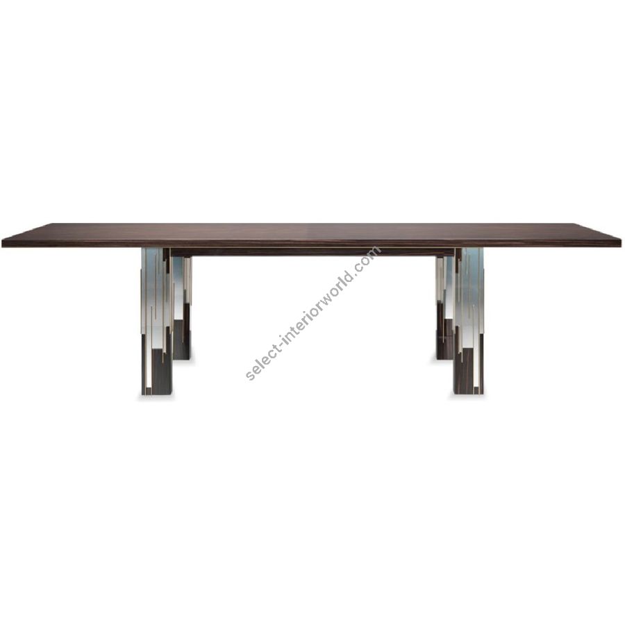 Dining table with wooden top 40 mm thick in shiny Ebony or shiny lacquered finish. Wooden legs with shaped decorations in shiny lacquered or in glazed steel with details in satin gold metal.