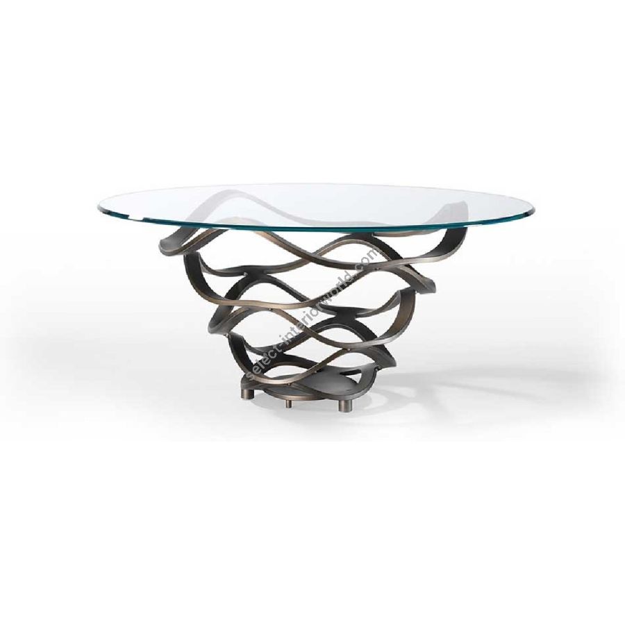Dining table with round or oval base in curved glass 24mm thick transparent, black lacquered or with brass or dark brass finish. Also available in extra clear 19mm thick transparent glass. Glass top 15mm thick with 45° bevel.