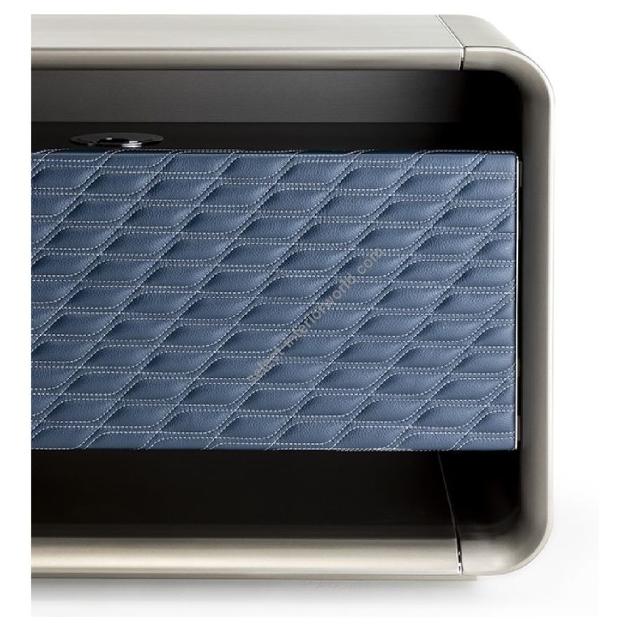 Side container with 2 drawers and 2 doors covered in quilted leather (matching front panel). Painted glass matching the structure on the top of the desk and the drawer unit.