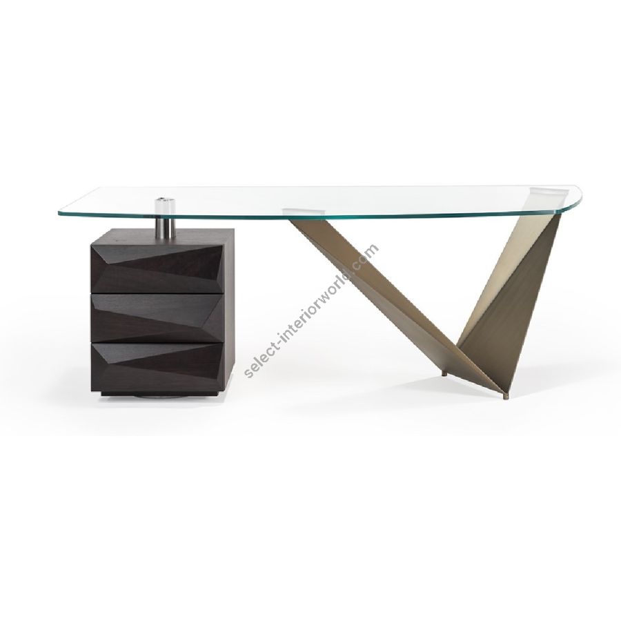 Desk with metal base in Bronze, brass, dark brass or titanium finish. Swivelling wooden unit with 3 drawers with shaped fronts in Canaletto walnut/Canaletto Henné or in matt lacquered finish or with straight fronts covered in lacquered glass. Support in brushed steel. Shaped top in transparent tempered glass 15 mm thick with polished edges with cable hole. On request top in BevelWood Canaletto walnut/Canaòetto Henné.