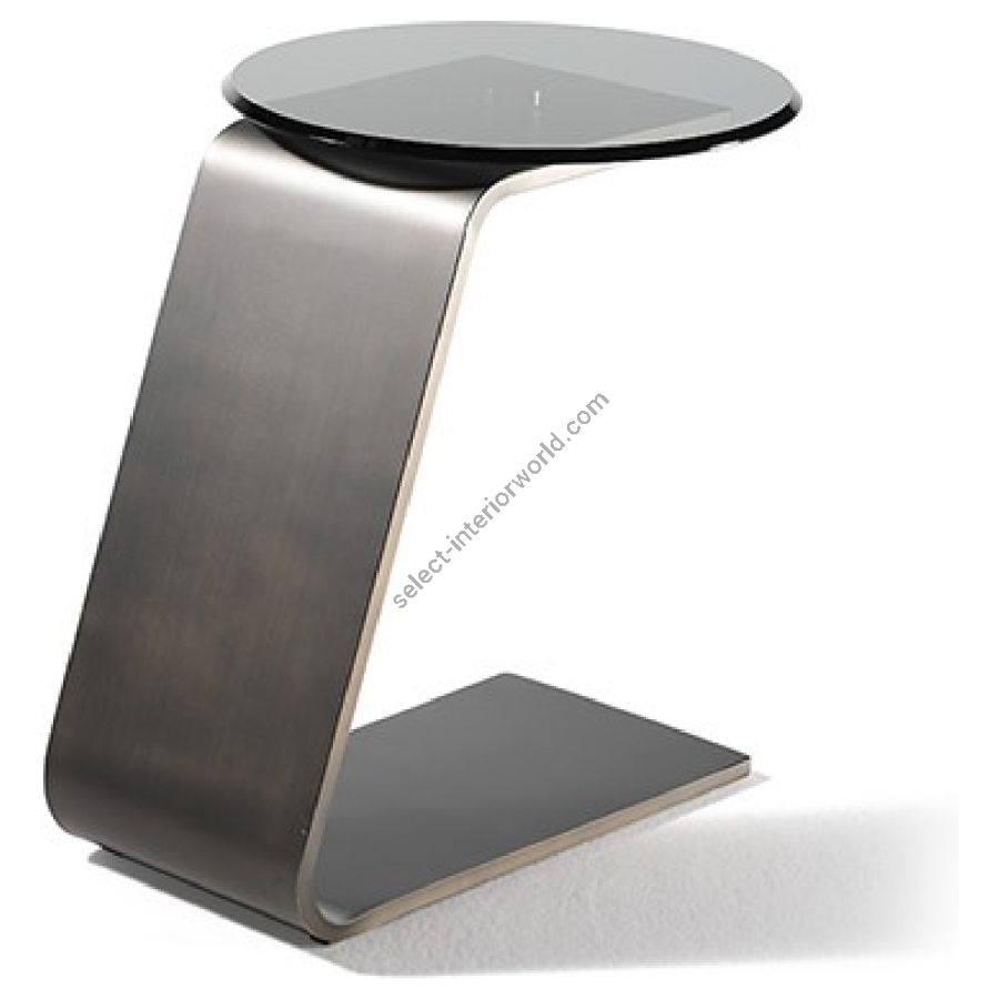 Side table in curved extra clear glass 15mm thick in Bronze, Brass, Drak brass and Titanium finish. Top in smoked glass 10mm thick with 45° bevel or in in Marmoreflex/Legnoreflex.