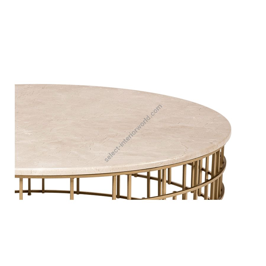 This piece is inspired by the brands icon, expressed subtly in its base. Its round shape and transparency make it light and easily adaptable to any environment. It offers a variety of options with a mix of finishes for both the top and base, making elements such as marble and leather stand out.