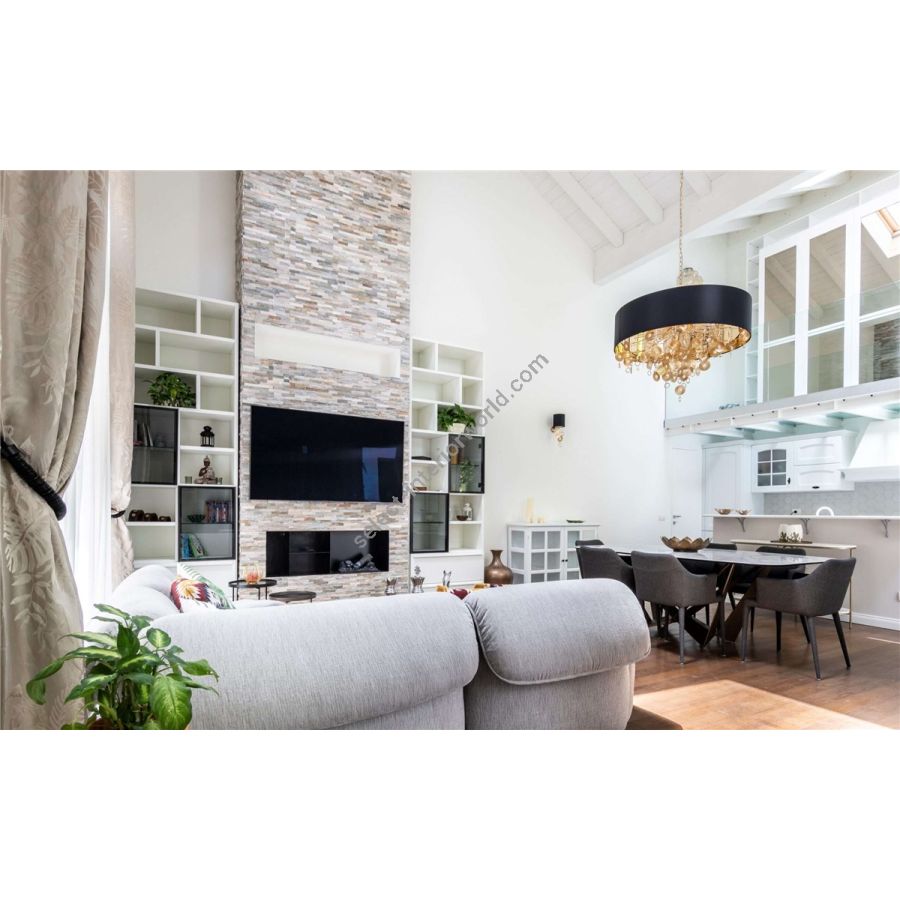 The chandeliers are basically used for the lighting of living rooms, dining rooms, bedrooms and prestigious reception areas, while the additional versions such as single pendant lamps, wall lamps, table lamps and floor lamps go to illuminate with elegance every further area of the project giving stylistic uniformity to the environment