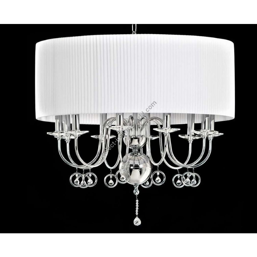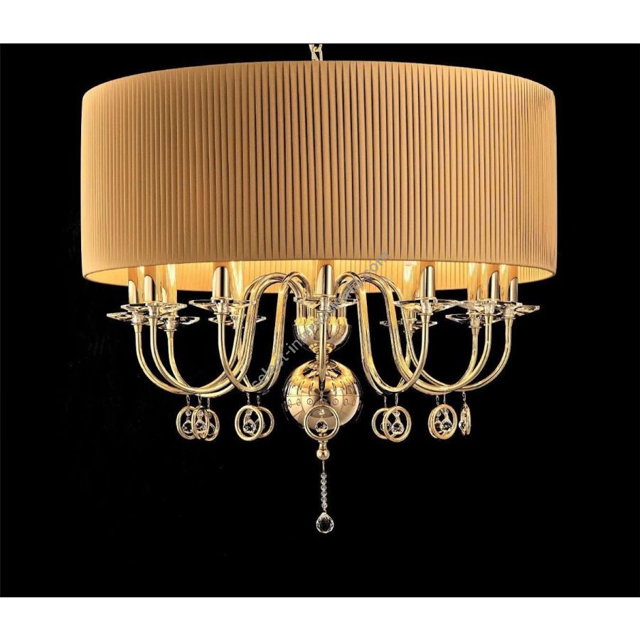 The structure of the chandelier ends at the bottom with an evident spherical motif in metal and crystal finalino and is inserted in a large cylindrical drum lampshade usually pleated but available on request also in rigid fabric, if you want to give a more modern look to the chandelier.