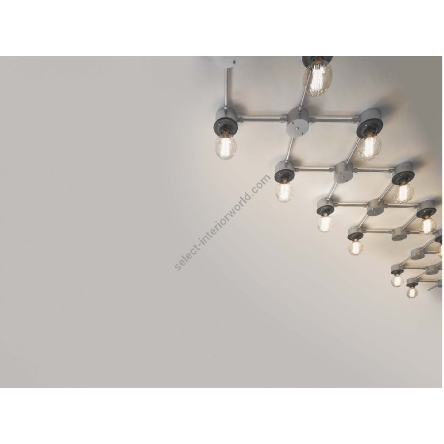 The spot consists of a base in antique brass or satin nickel and from a ceramic lamp holder, glossy white or glossy black finishing. It can be used as a single spot or with more right angle outputs. Conduits are available in the same finishes of the spot. The connection box, which may be used as in the photo presented of the catalog, can be used to realize a strip of square.