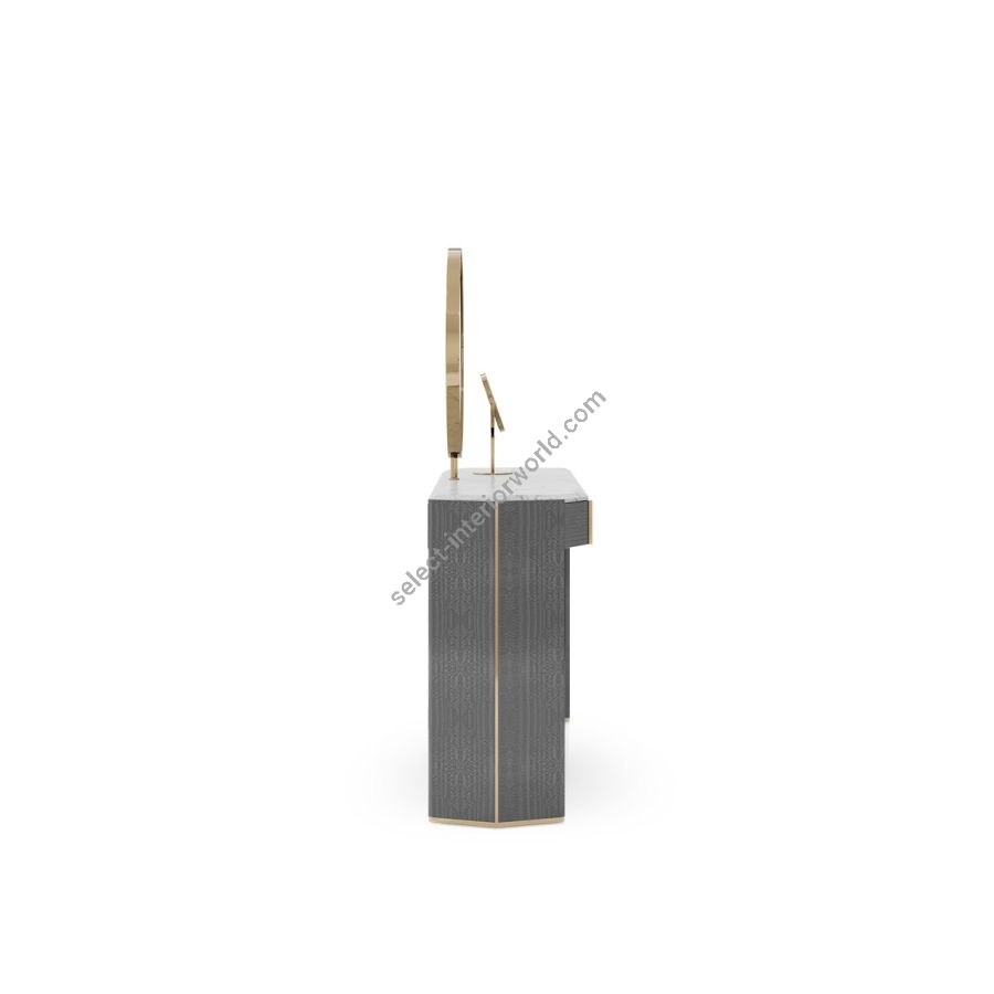 Incorporate a new sense of modernity that only marble can provide into a bedroom, closet, or vanity area with the Algerone Dressing Table. A luxury item made with the most premium materials, such as polished brass, Eucalyptus Frisé Veneer, mirror, and Statuario marble, that has a powerful presence in any ambiance.