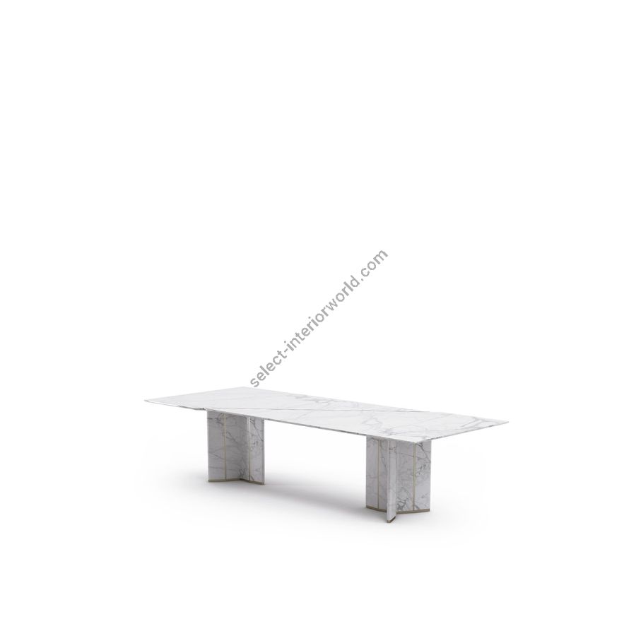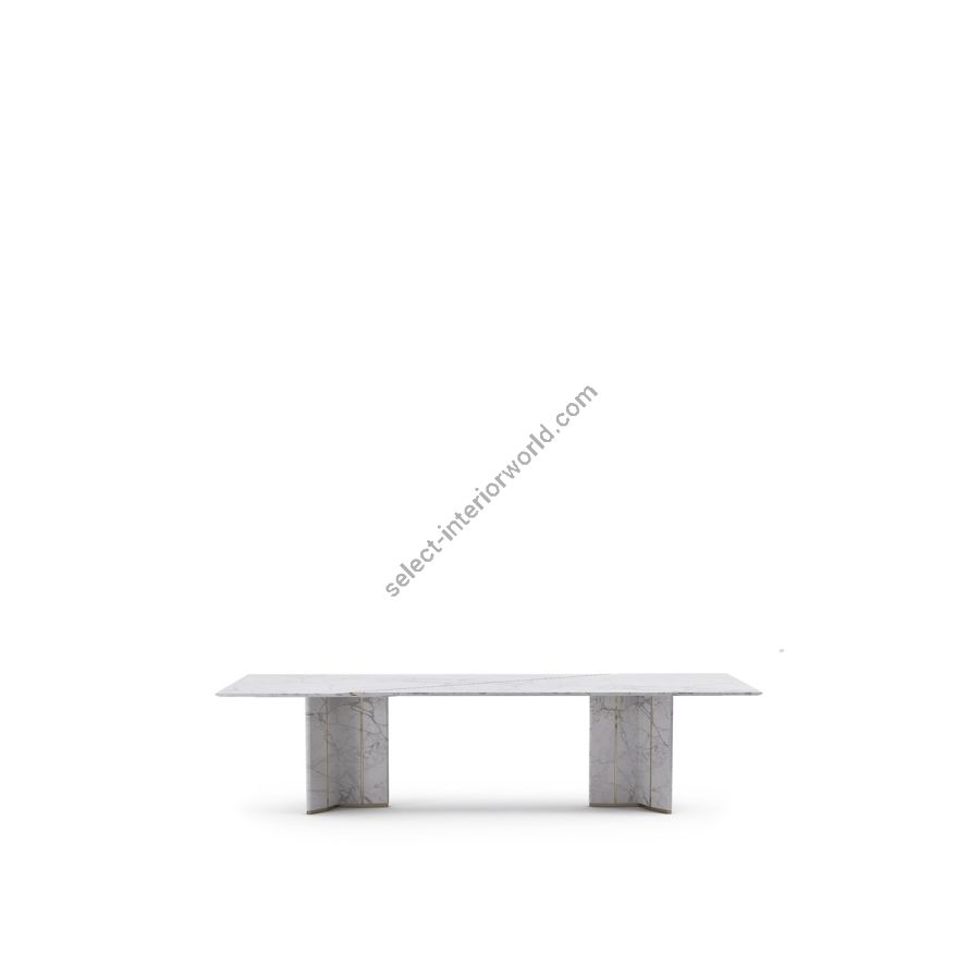 Algerone is an imposing rectangular dining table inspired by sleek architectural elements. This classic piece showcases the strength and classic nature of Statuario marble, which is further enhanced by the presence of meticulously placed brass lines. The intertwinement of these materials makes for quite an alluring decor statement.