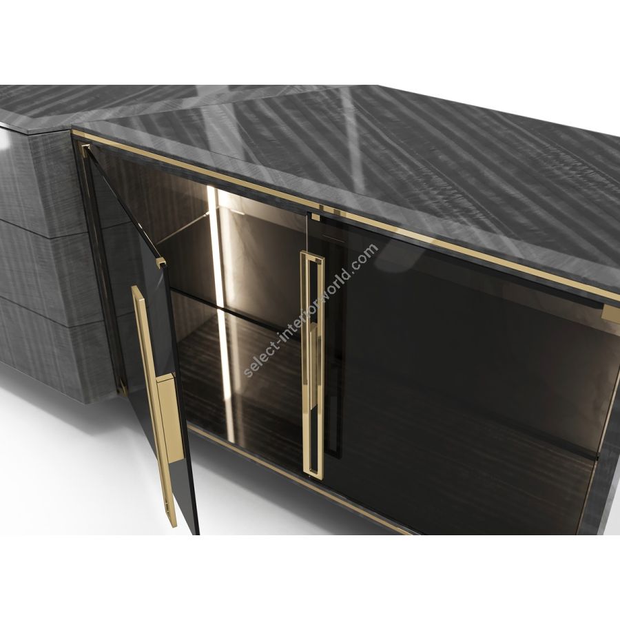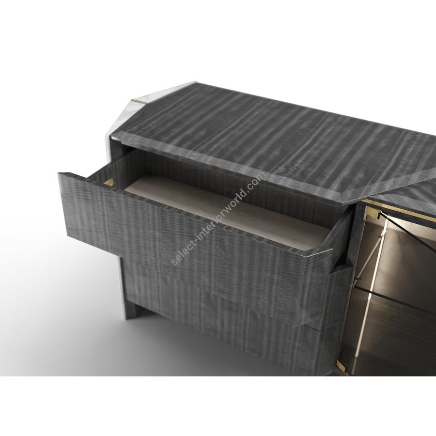The Algerone Sideboard showcases a medley of luxurious materials while providing practical functionality. The smoked glass doors add a touch of sophistication and offer a glance at the items stored inside. With the powerful presence of Statuario marble and the opulent appeal of polished brass details, this design piece will make a modern statement in any dining room or hallway decor.