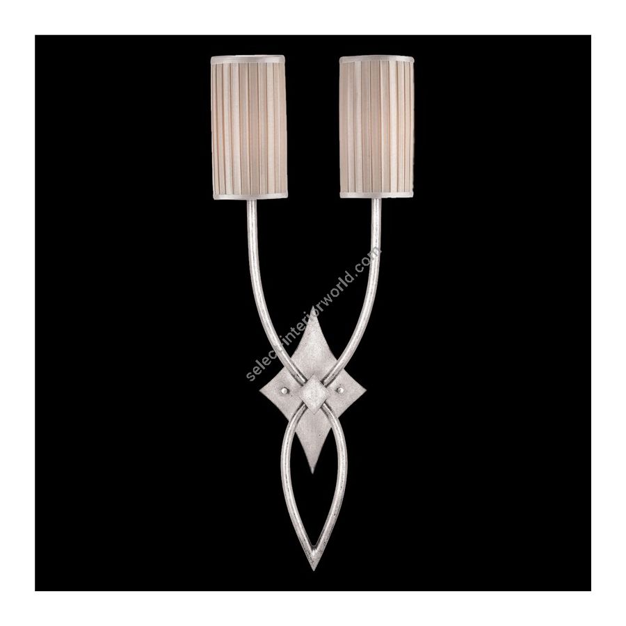 Wall sconce in platinized silver finish features intersecting curve design. Hand-tailored shades feature elegantly folded pleats of smooth ivory.